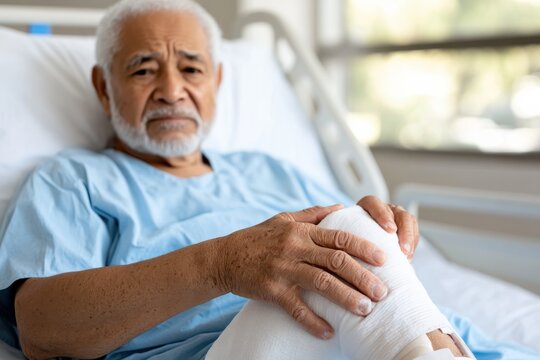 An elderly man in a hospital bed touches his bandaged knee, reflecting on his life experiences and challenges faced, evoking a sense of dignity and emotional depth in recovery.