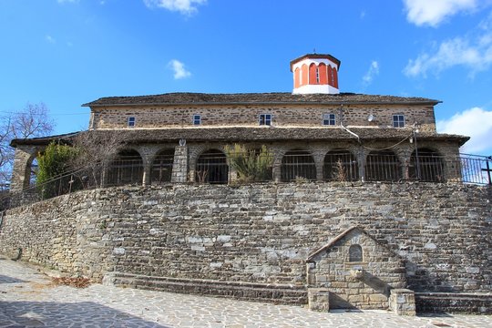 The old orthodox church of "Agios Dimitrios" with red dome and the stone spring at the  village of Frangades at Zagorochoria at the region of Ioannina in Epirus Greece