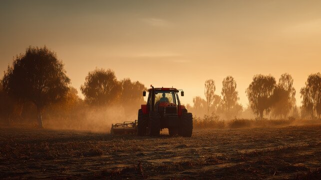 Red Tractor Plows Field at Sunrise, Tilling Soil with Disc Harrow in Golden Light