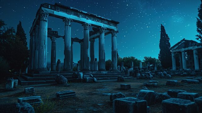 The remnants of an ancient Greek agora beneath a starry sky, ideal for historical, architectural, and astrological themes, with space for text.