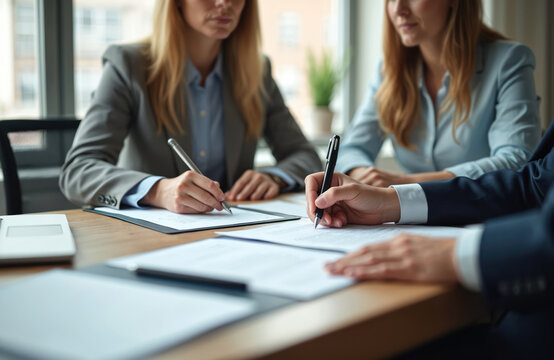 Lawyers and clients signing contract agreement after legal advice consultation. Lawyers and clients are signing contract agreements on a wooden table, legal proceedings and agreement.