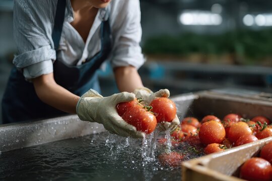Sanitizing fresh produce in a modern agricultural facility to ensure public health and safety during harvesting and preparation processes