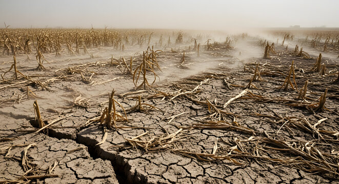 Arid farmland landscape with cracked earth and dry stalks symbolizing drought and agricultural crisis