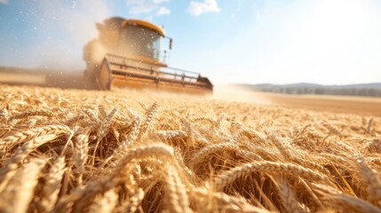 In a wheat field, a harvester is seen working in the distance, with the focus on the foreground grains, capturing the essence of agricultural life and growth.