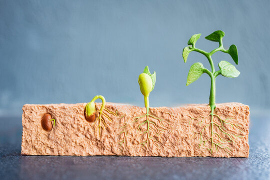 Educational plant growth model showing seed germination to seedling stages, representing biology learning, agricultural development, life cycle, and nature-based education.