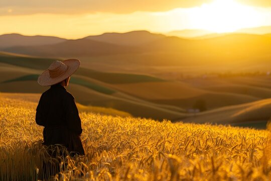 Farmer in a straw hat overlooking a vast golden wheat field during a warm sunset, symbolizing harvest and agricultural life