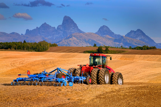 Tractor Farming Ground Harvesting Crops in Fall Autumn Teton Mountains Rugged