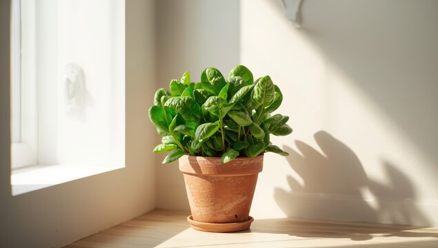 Green spinach growing in a clay container outdoors, highlighting home gardening practices, natural daylight, leafy vegetable, agricultural setting