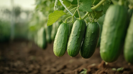 Fresh cucumbers hanging on vines in a lush greenhouse during the early morning sunlight in a vibrant agricultural setting Generative AI
