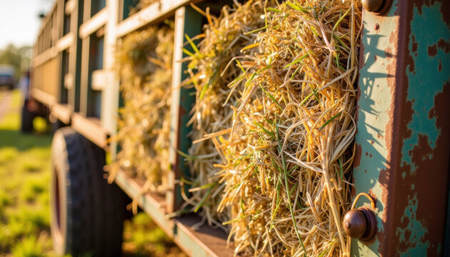 Old agricultural trailer loaded with hay in sunlit farm setting