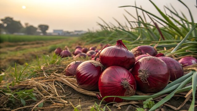 Red Onion Harvest: A close-up shot of plump red onions resting on the ground in a field, bathed in the warm glow of the setting sun.  The onions are arranged in a beautiful and enticing display.