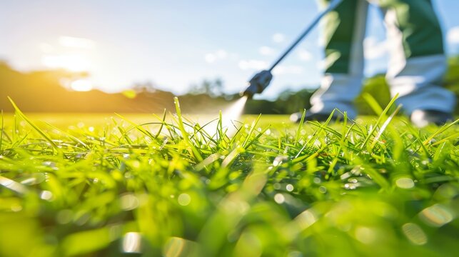 Worker spraying pest control solution on a lush green lawn for effective pest management