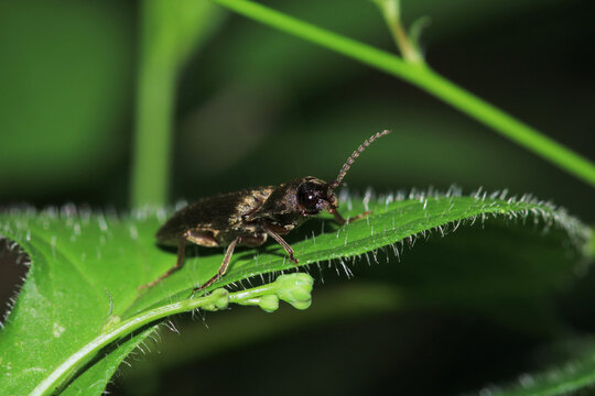 Agrilus, probably agrilus cyanescens.  Family jewel beetles or metallic wood-boring beetles (Buprestidae). On a leaf of Canadian goldenrod (Solidago Canadensis). Dutch garden, summer, June