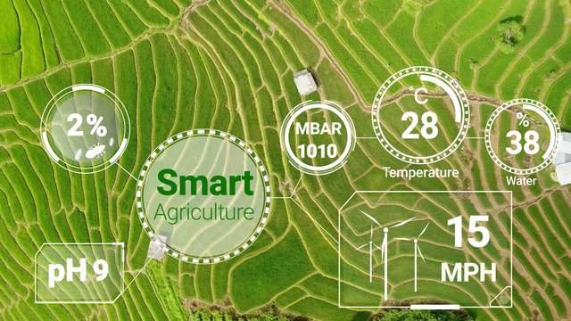 Smart digital agriculture technology by futuristic sensor data collection management by artificial intelligence to control quality of crop growth and harvest. Computer aided plantation grow concept.