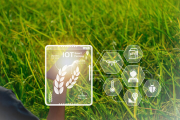 Innovative intelligent farm system technology, agricultural management with intelligent technology concept, data collection for research, and rice tree background are sprouting.