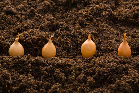 Row of onion bulbs in fresh dark soil. Closeup. Preparation for garden season. Front view.