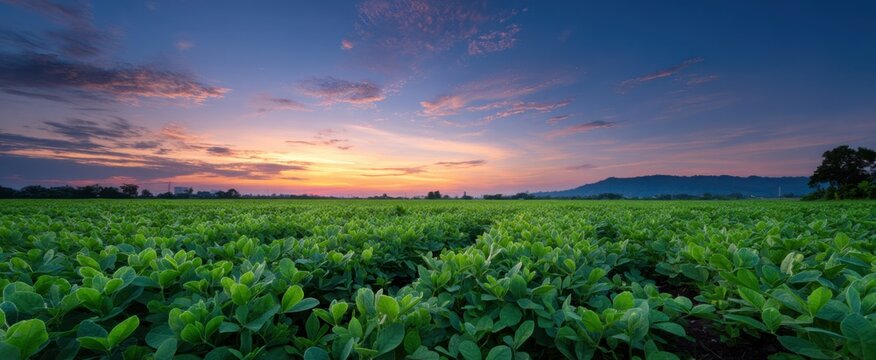 A lively soybean field glows like emerald jewels under a dazzling sunset sky.