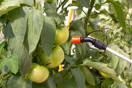 A farmer sprays tomatoes with pesticides in a greenhouse. Protection of vegetables from insects.