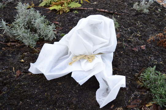 Closeup winter agrotextile cover to cover frost-sensitive rose bush with blurred background in garden