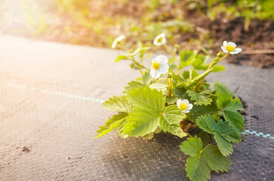 Wild strawberry in blossom on an organic farm field patch covered with agrotextile (fabric mulch mat) at sunset, selective focus.