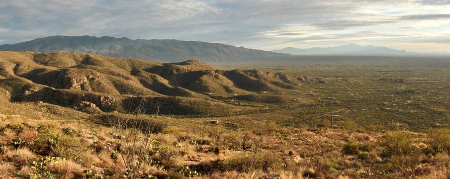 Panorama of Agua Caliente Hill, the Rincon Mountains, and Saguaro National Park in the Sonoran Desert of Tucson, Arizona.