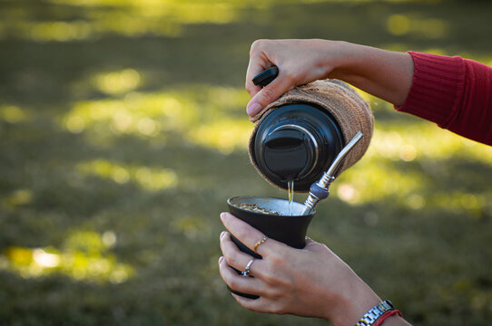 manos suaves de mujer joven cebando o sirviendo mate, mañana fresca en el parque al aire libre.
