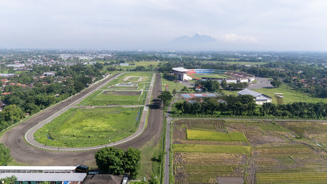 View of Sultan Agung Stadium and a racing track in Bantul, Yogyakarta surrounded by lush fields