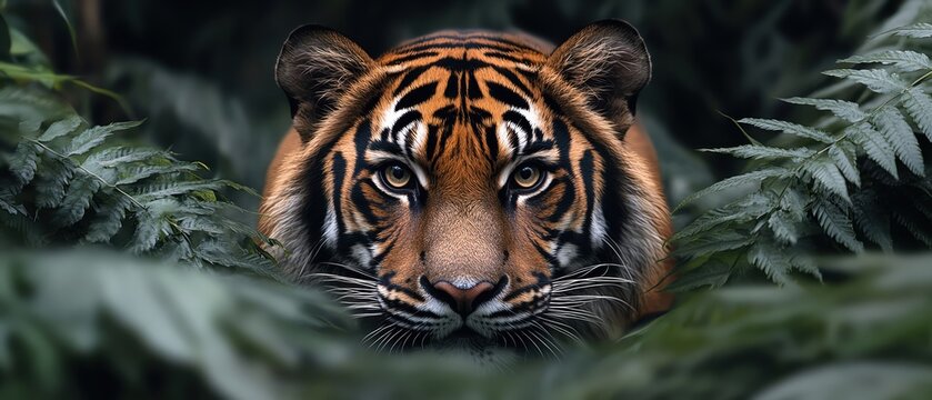 Bengal tiger stealthily emerges from dense green foliage, eyes focused ahead