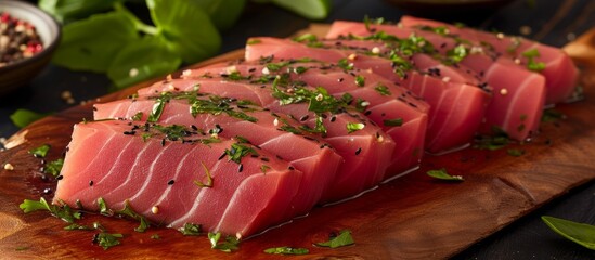 Sliced ahi tuna steak with herbs, uncommon and fresh
