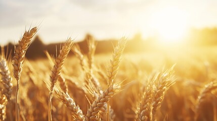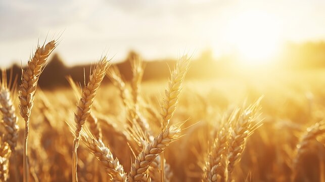 Golden wheat stalks swaying gently in the breeze under a vibrant sunlit sky during a beautiful summer evening : Generative AI