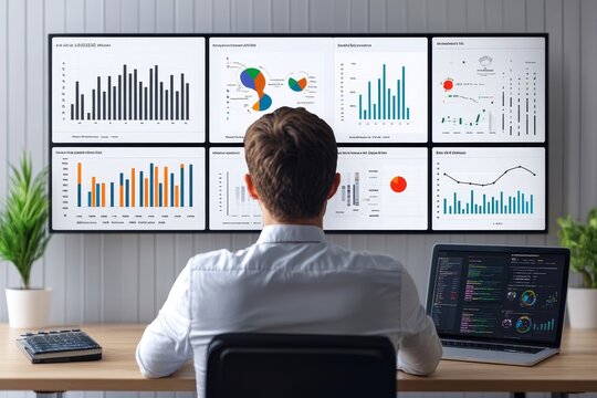 An analyst uses Data analytics automated with AI technology. Dashboard report, operations charts and KPI insights. Big Data technology, Business analysis and artificial intelligence automation.