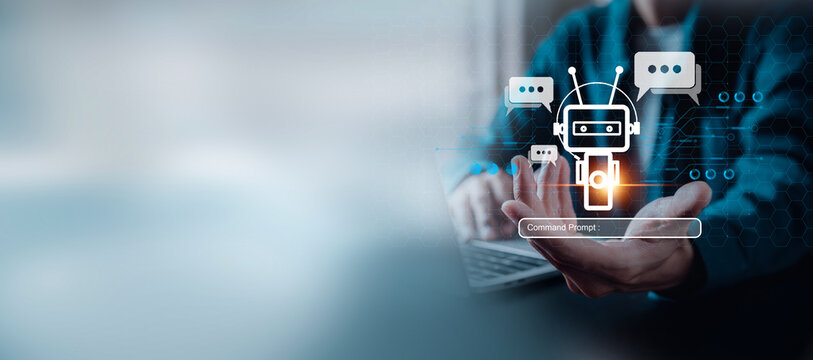 Man online chatting with AI chat bot on smartphone. Artificial intelligence robot innovation technology communicates and answers questions with smart conversation and provides creative solution ideas.