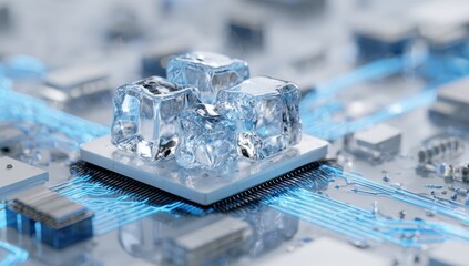 Ultra highresolution, professional studio photography of closeup of a glowing blue computer processor chip on a circuit board, symbolizing advanced technology and artificial intelligence