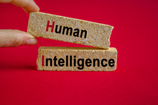 Concept word Human intelligence on brick blocks. Beautiful wooden table yellow background. Hourglass. Business concept