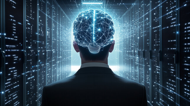 A business professional viewed from behind, with a glowing digital brain overlay, standing in a data server room symbolizing AI and innovation
