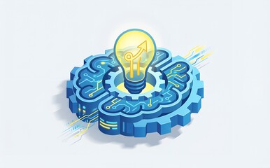 Isometric 3D render of a blue digital brain with a rotating gear and a glowing yellow lightbulb, representing artificial intelligence innovation, creative thinking, and machine learning growth