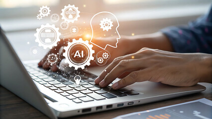 Hands typing on a laptop with ai graphics overlay, representing artificial intelligence technology and machine learning for business automation and digital innovation