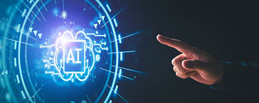 Ai, artificial intelligence technology. Finger touch on HUD interface hologram. Concept of futuristic innovation machine learning, information network, online system, automation, cyberspace in blue.