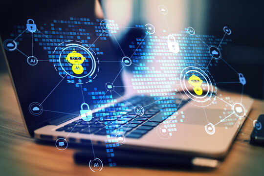 Artificial intelligence chatbot icons connected over a digital network interface on a laptop screen in a modern office workspace environment.