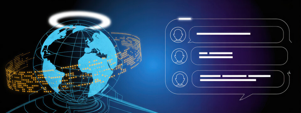 Ai avatar interacting with chat bubbles in futuristic hud interface, neon cybernetic data