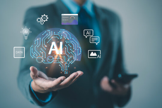 Businessman holding a virtual AI brain interface with data and chat icons, representing artificial intelligence, digital transformation, machine learning, and innovative business technology.