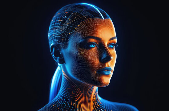 Artificial intelligence in humanoid head with neural network thinks. AI with Digital Brain is learning processing big data, analysis information. Face of cyber mind. Technology background concept.
