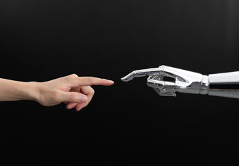 Human and robot hands reaching out to touch. Symbolizes human-AI interaction, futuristic cooperation. Technology and innovation concept. Cybernetic partnership.