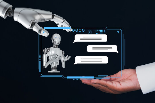 Artificial Intelligence Concept.,Chat bot with ai interface among Human hand holding with robot hand over black background idea for Data Analytics, Automation, Machine Learning,Business,Science.