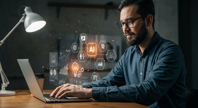 AI innovation and intelligent agents concept. A person working on a laptop holding a light bulb with digital AI icons, symbolizing artificial intelligence, automation, creativity and smart solutions.