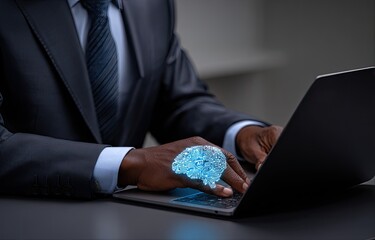 Businessman utilizing ai and automation tools for business data analysis and workflow optimization on a laptop in a modern office