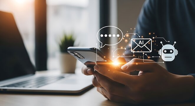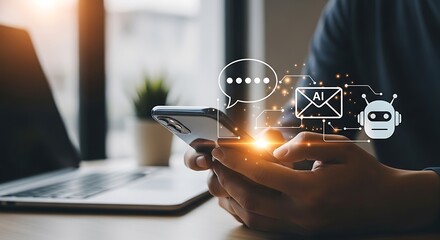 person interacts with a laptop display a transparent holographic interface featuring icons of chatbots,user,and text messages,representing AI communication,digital chat systems,and virtual assistance.