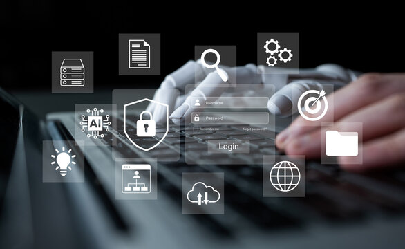 A close-up of a hand typing on a keyboard with transparent digital icons depicting technology and security concepts, highlighting innovation and data privacy. Gantry
