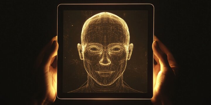 Hands hold a tablet showing a glowing head outline on a dark screen, representing the concept of artificial intelligence and robotics.
