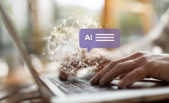 Close-up of hands typing on laptop, AI chat bubbles overlay